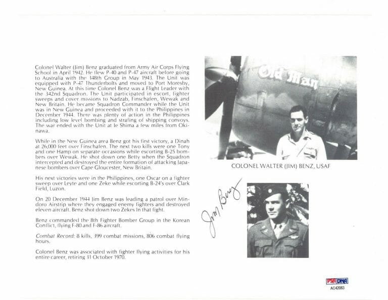 WALTER BENZ SIGNED 8X10 (D) PSA DNA AC42083 WWII ACE 8 KILLS COLLECTIBLE MEMORABILIA