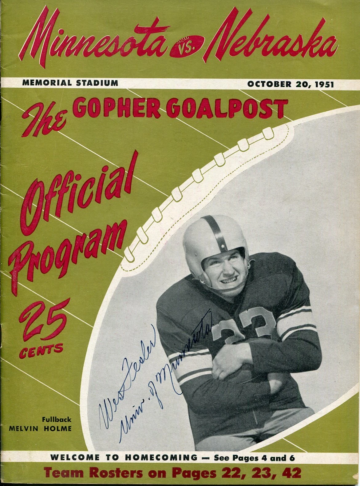 WES FESLER MINNESOTA GOLDEN GOPHERS OHIO STATE SIGNED AUTOGRAPH 1951 PROGRAM JSA COLLECTIBLE MEMORABILIA
