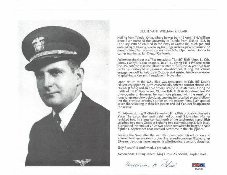 WILLIAM BLAIR SIGNED 8X10 (D) PSA DNA AC42105 WWII ACE 5 KILLS COLLECTIBLE MEMORABILIA