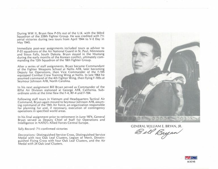 WILLIAM BRYAN SIGNED 8X10 (D) PSA DNA AC42145 WWII ACE 7.5 KILLS COLLECTIBLE MEMORABILIA