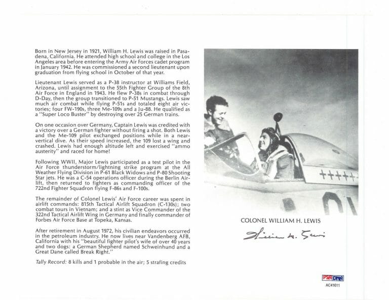 WILLIAM LEWIS SIGNED 8X10 (D) PSA DNA AC41611 WWII ACE 8 KILLS COLLECTIBLE MEMORABILIA