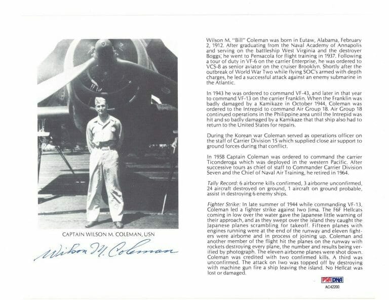 WILSON COLEMAN SIGNED 8X10 (D) PSA DNA AC42200 WWII ACE 6 KILLS COLLECTIBLE MEMORABILIA
