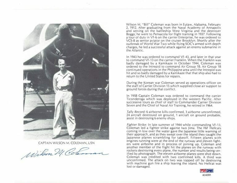 WILSON COLEMAN SIGNED 8X10 (D) PSA DNA AC42201 WWII ACE 6 KILLS COLLECTIBLE MEMORABILIA