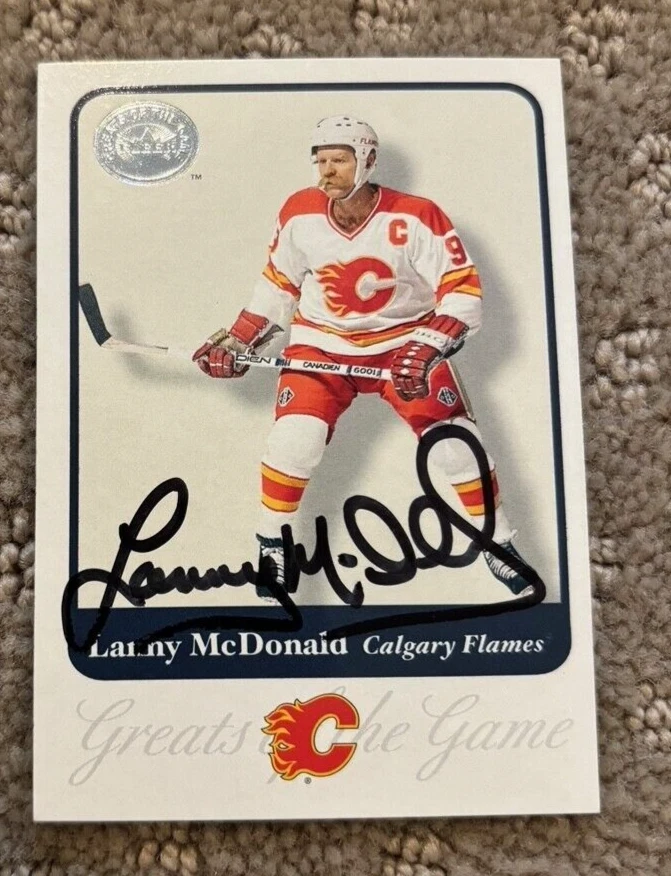 2001-02 FLEER GREATS OF THE GAME SIGNED AUTOGRAPHED CARD #53 LANNY MCDONALD COLLECTIBLE MEMORABILIA