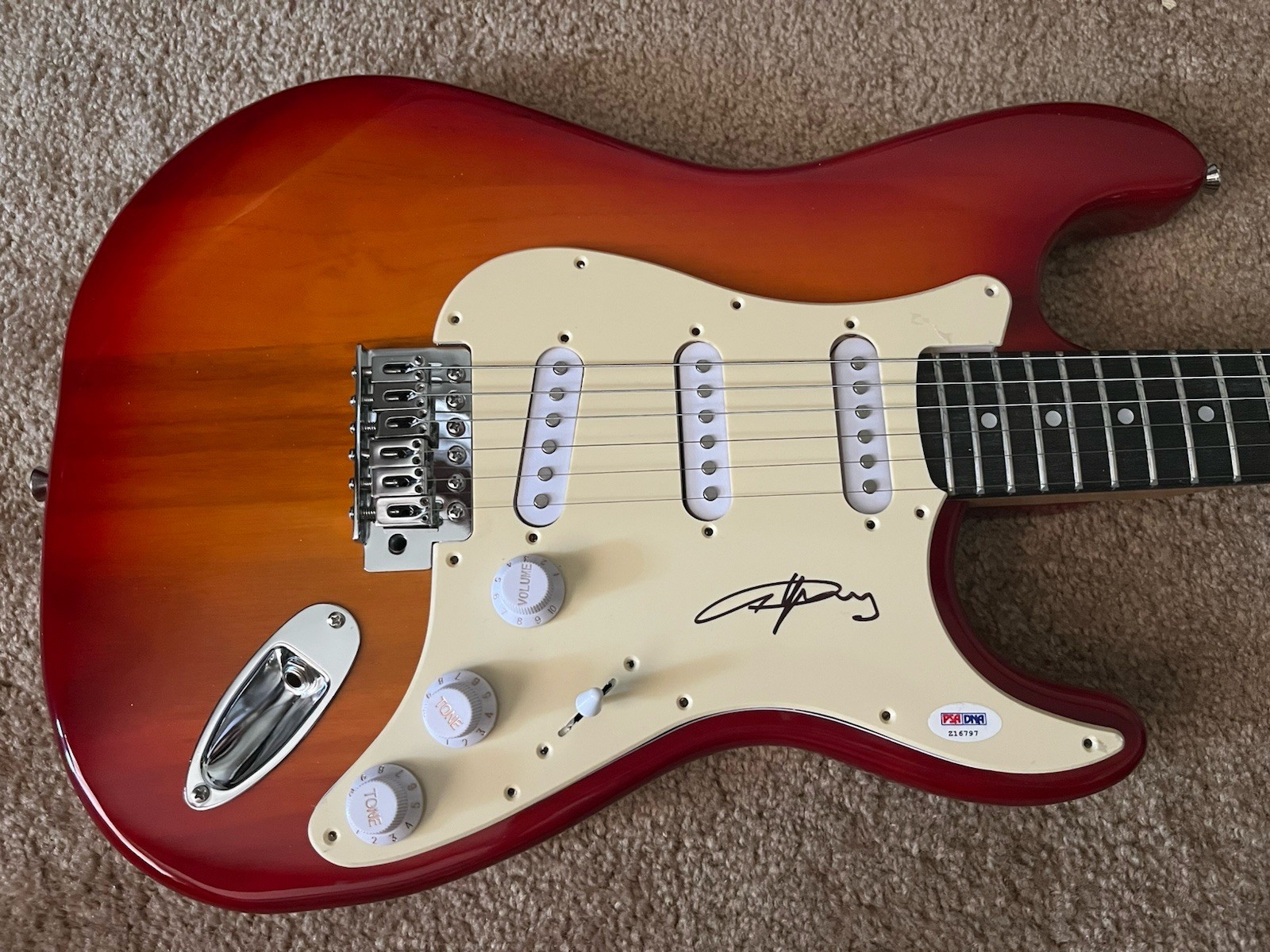 Buy this 100% authentic autographed guitar now. Every signed guitar we sell includes a unique stickered authenticity card with a dual matching hologram. We work with trusted autograph experts in the industry, so you can rest assured that each guitar is hand-signed by the musicians themselves.