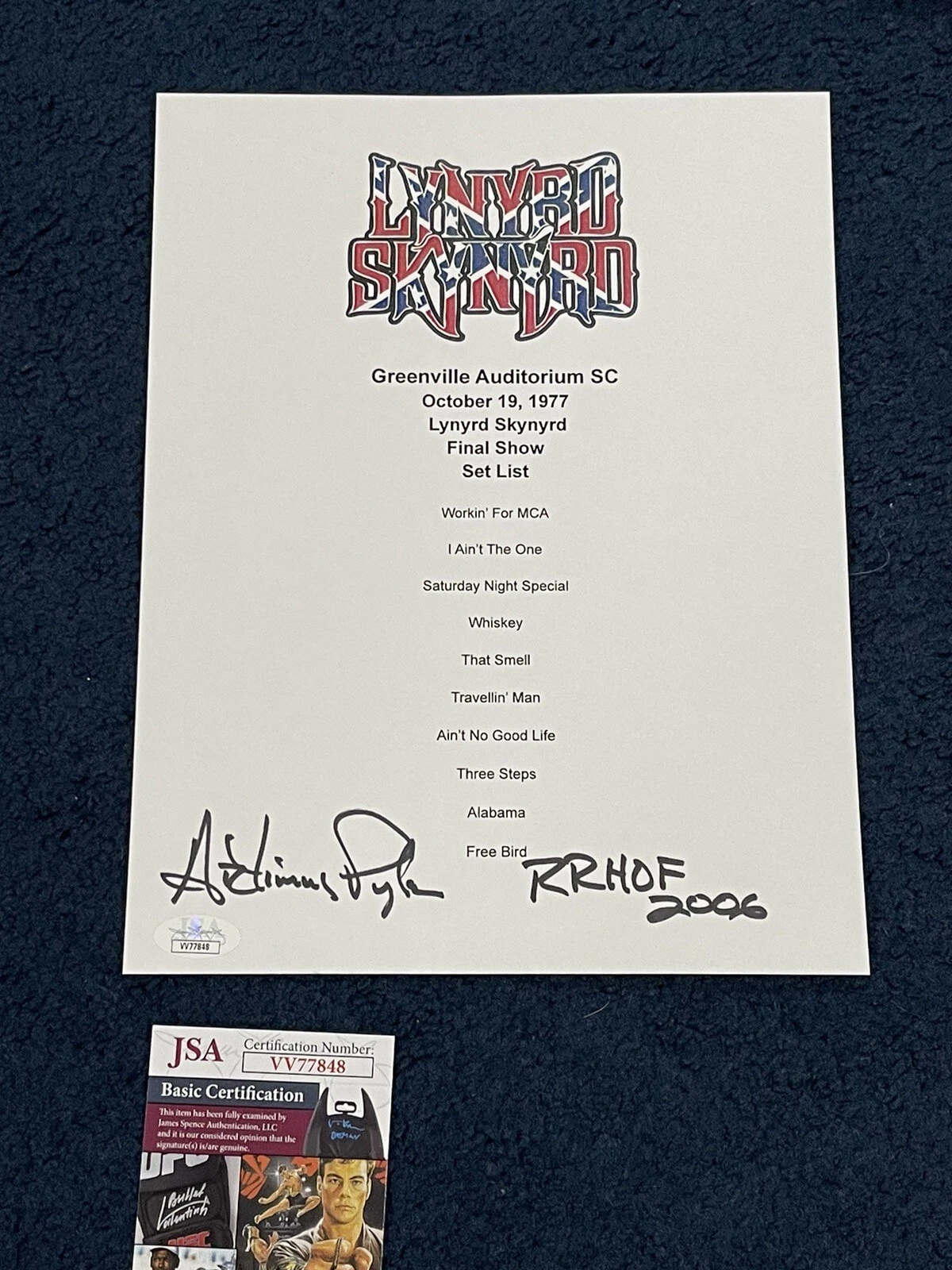 ARTIMUS PYLE LYNYRD SKYNYRD SIGNED FINAL SHOW SET LIST SHEET JSA COLLECTIBLE MEMORABILIA