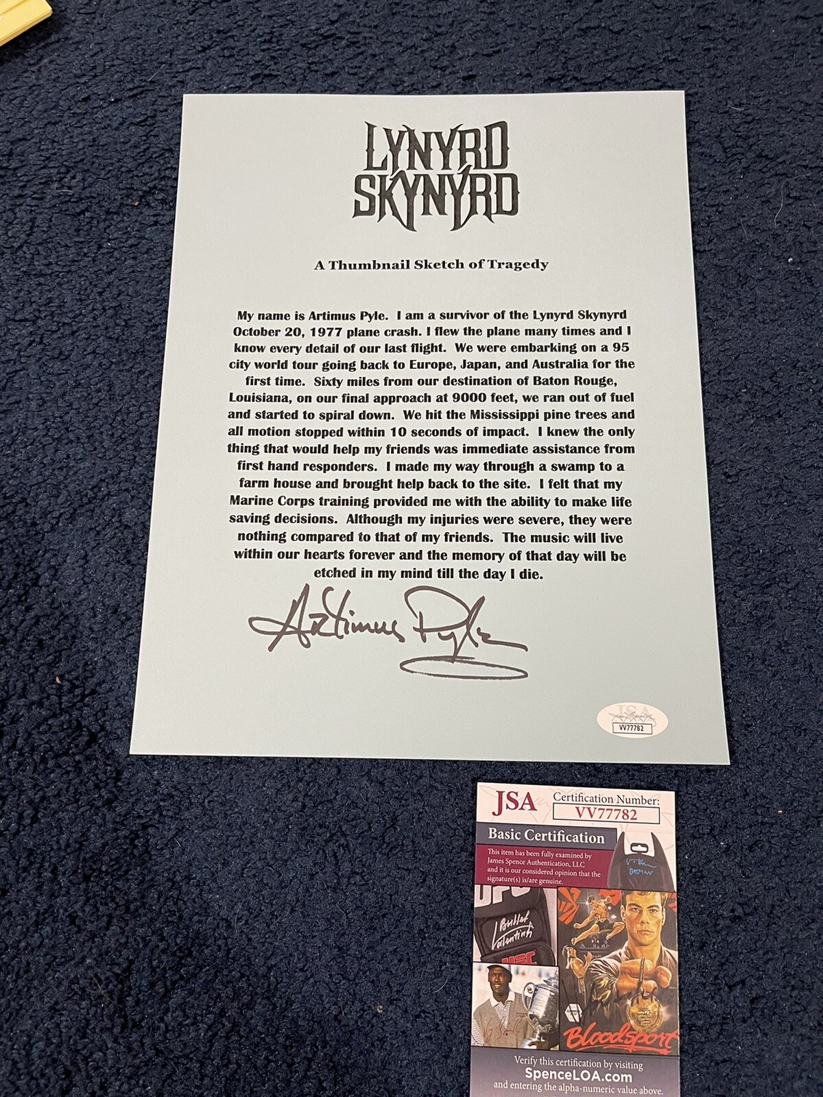 ARTIMUS PYLE LYNYRD SKYNYRD SIGNED THUMBNAIL SKETCH OF TRAGEDY – PLANE CRASH JSA COLLECTIBLE MEMORABILIA