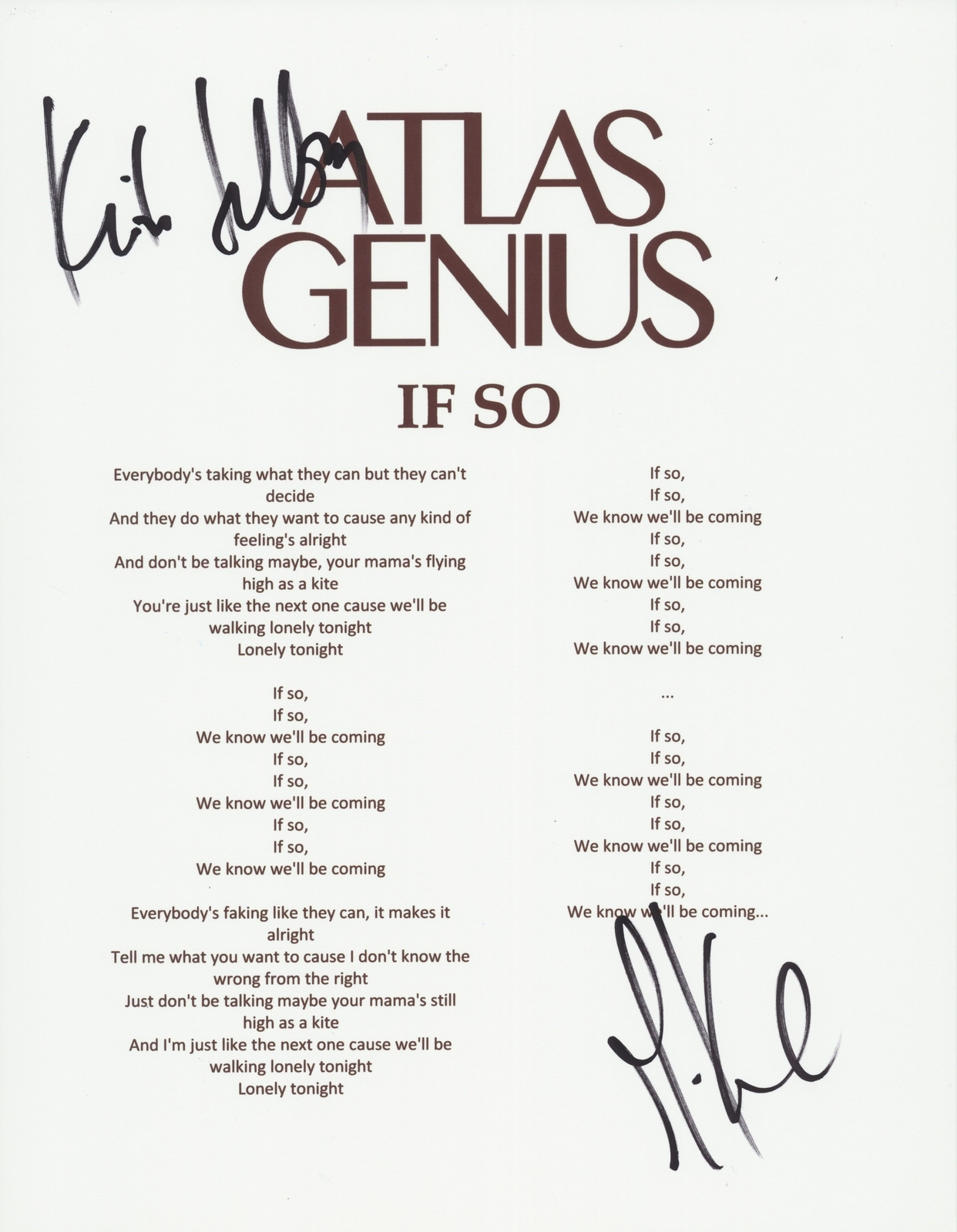 ATLAS GENIUS SIGNED IF SO LYRIC SHEET COLLECTIBLE MEMORABILIA