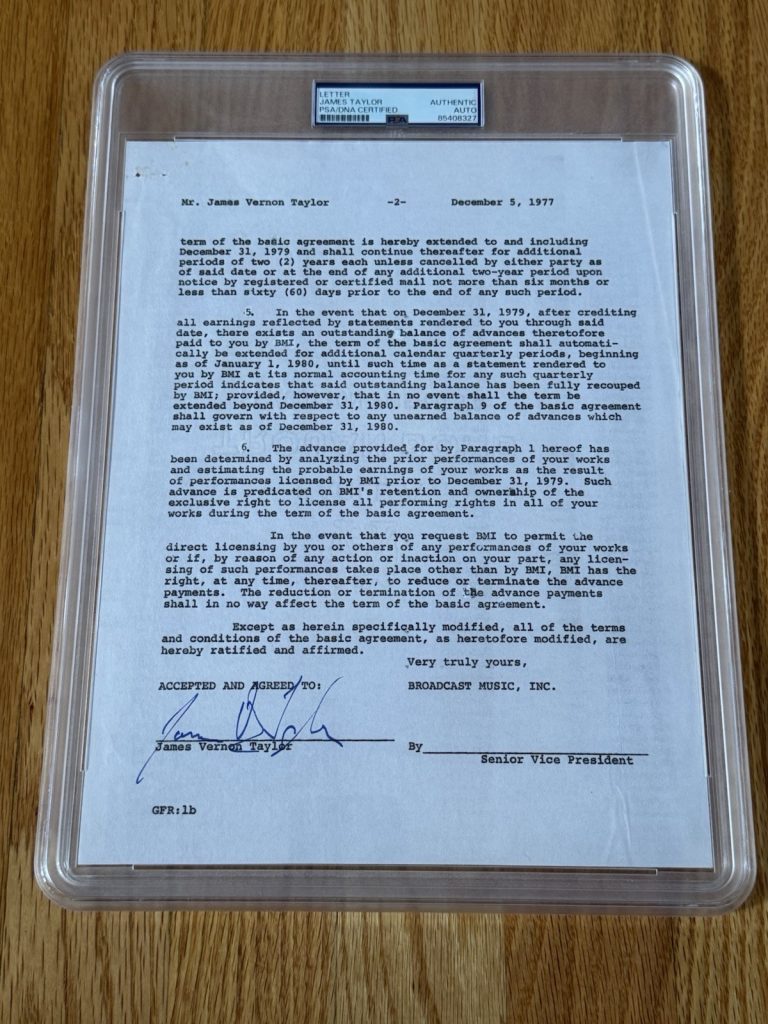 AWESOME JAMES TAYLOR SIGNED CONTRACT PSA SLABBED MUSIC LEGEND COLLECTIBLE MEMORABILIA
