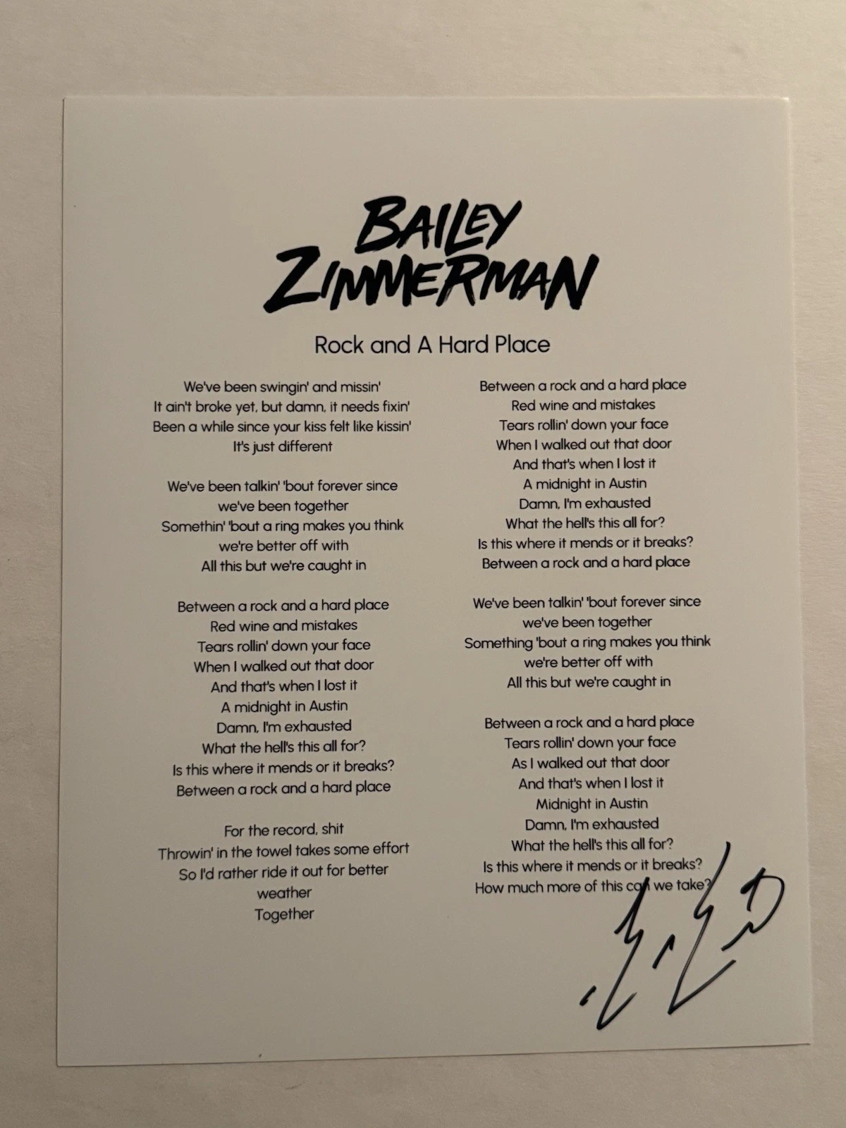 BAILEY ZIMMERMAN HAND SIGNED LYRIC SHEET AUTOGRAPHED COUNTRY SINGER RARE COA COLLECTIBLE MEMORABILIA