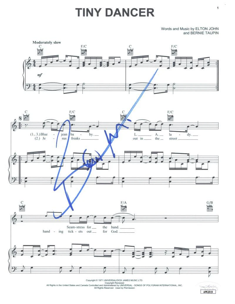 BERNIE TAUPIN SIGNED AUTOGRAPH TINY DANCER SHEET MUSIC – ELTON JOHN W/ JSA COA COLLECTIBLE MEMORABILIA