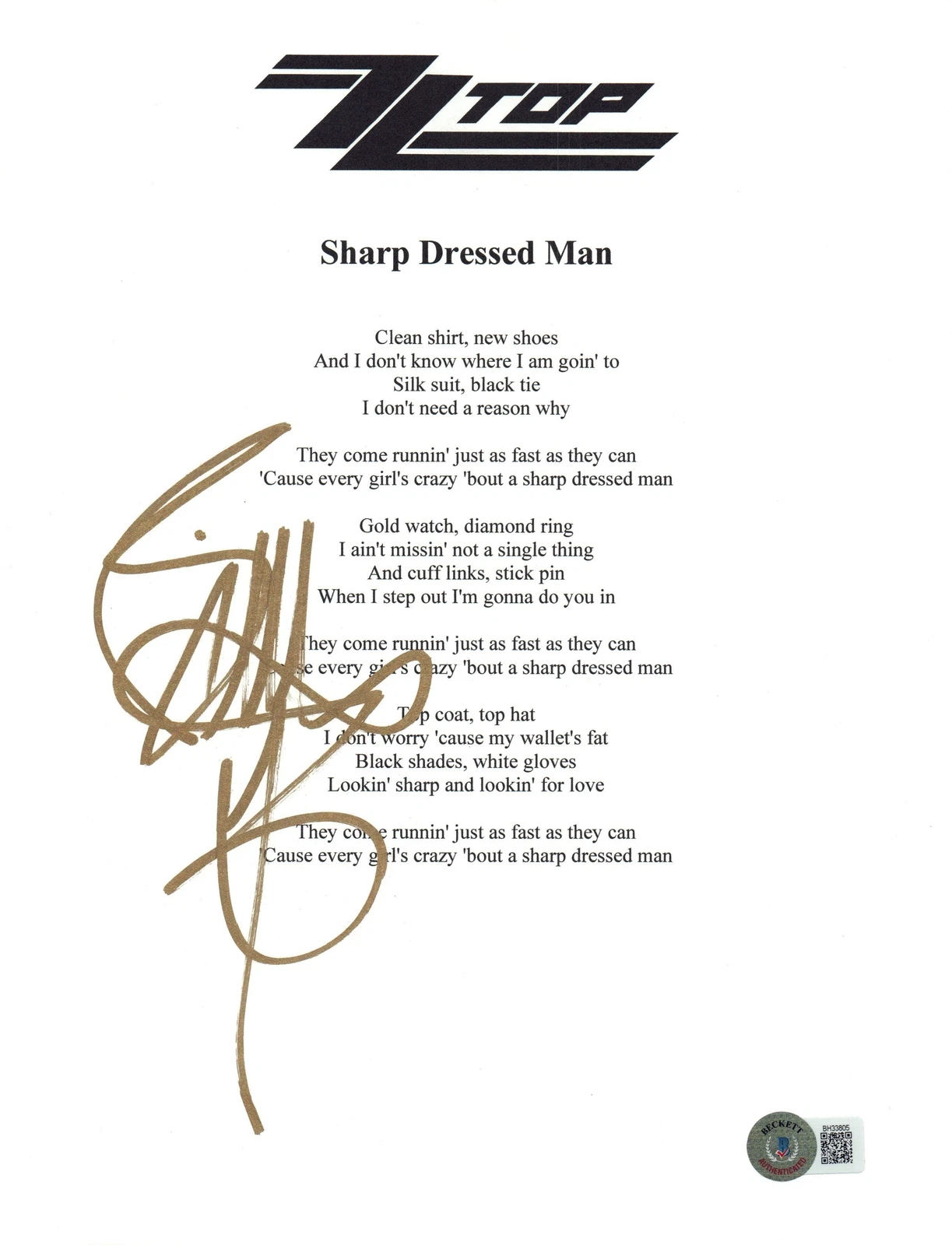 BILLY GIBBONS SIGNED AUTOGRAPH ZZ TOP SHARP DRESSED MAN LYRIC SHEET BECKETT COA COLLECTIBLE MEMORABILIA