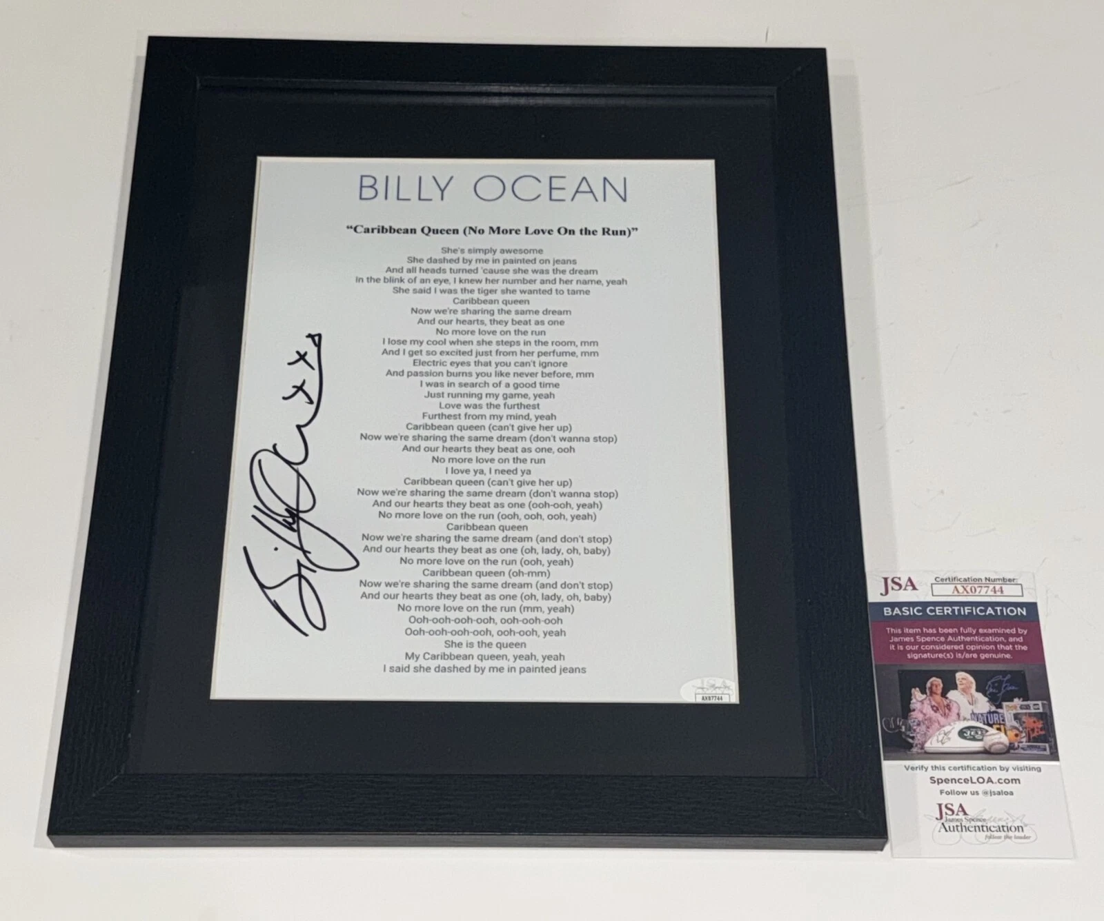 BILLY OCEAN SIGNED FRAMED CARRIBEAN QUEEN LYRIC SHEET AUTOGRAPHED JSA COA COLLECTIBLE MEMORABILIA