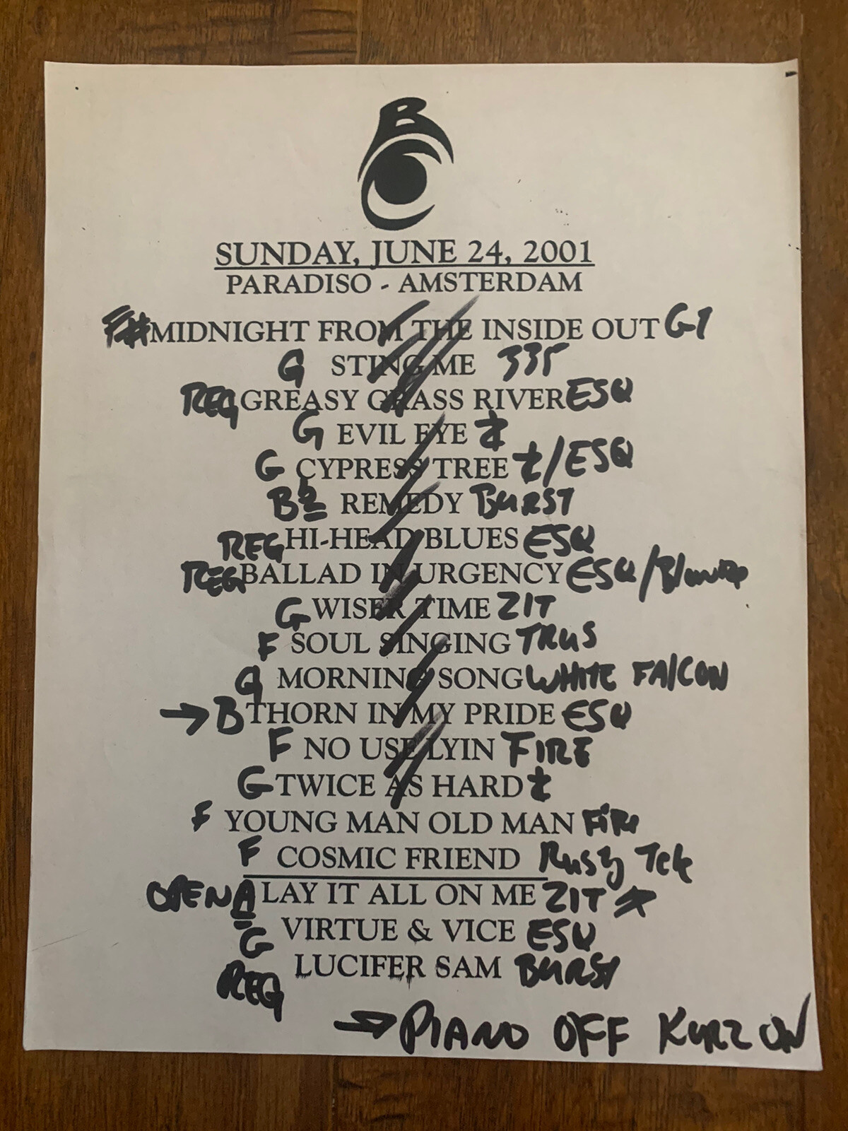 BLACK CROWES BAND 6-24-01 TOUR CONCERT USED SET LIST W NOTES PARADISO, AMSTERDAM COLLECTIBLE MEMORABILIA