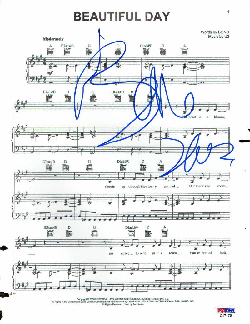 BONO U2 SIGNED AUTOGRAPH BEAUTIFUL DAY SHEET MUSIC – JOSHUA TREE, WAR W/ PSA COA COLLECTIBLE MEMORABILIA