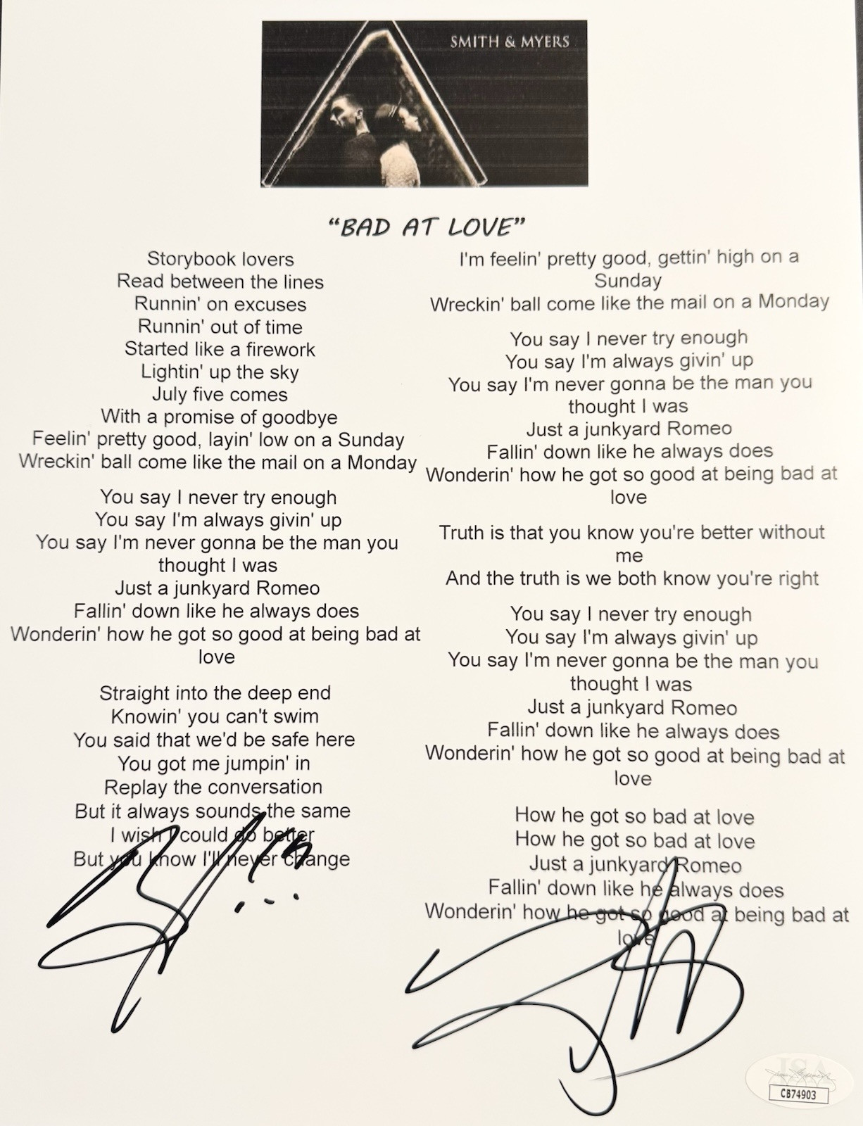 BRENT SMITH & ZACH MYERS SIGNED AUTOGRAPHED “BAD AT LOVE” LYRIC SHEET JSA COA COLLECTIBLE MEMORABILIA