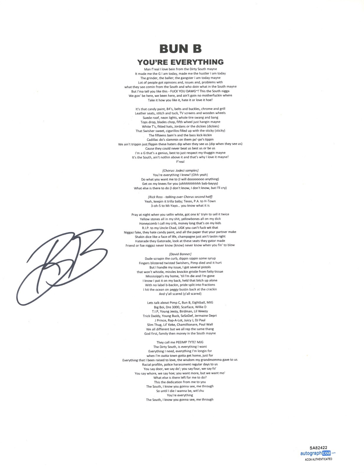 BUN B SIGNED AUTOGRAPHED YOU’RE EVERYTHING LYRIC SHEET HIP HOP RAPPER ACOA COA COLLECTIBLE MEMORABILIA