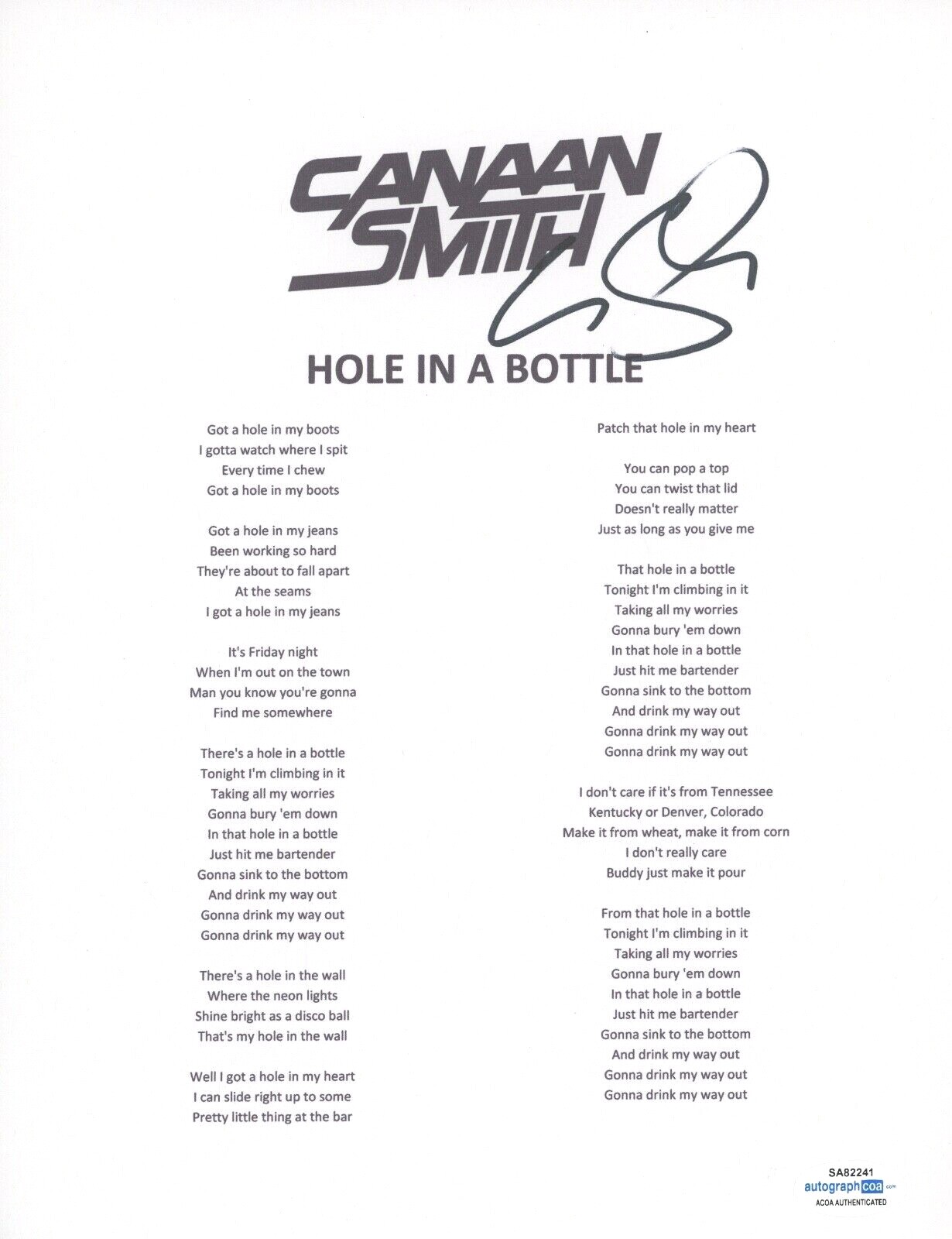 CANAAN SMITH SIGNED AUTOGRAPH HOLE IN A BOTTLE LYRIC SHEET COUNTRY STAR ACOA COA COLLECTIBLE MEMORABILIA