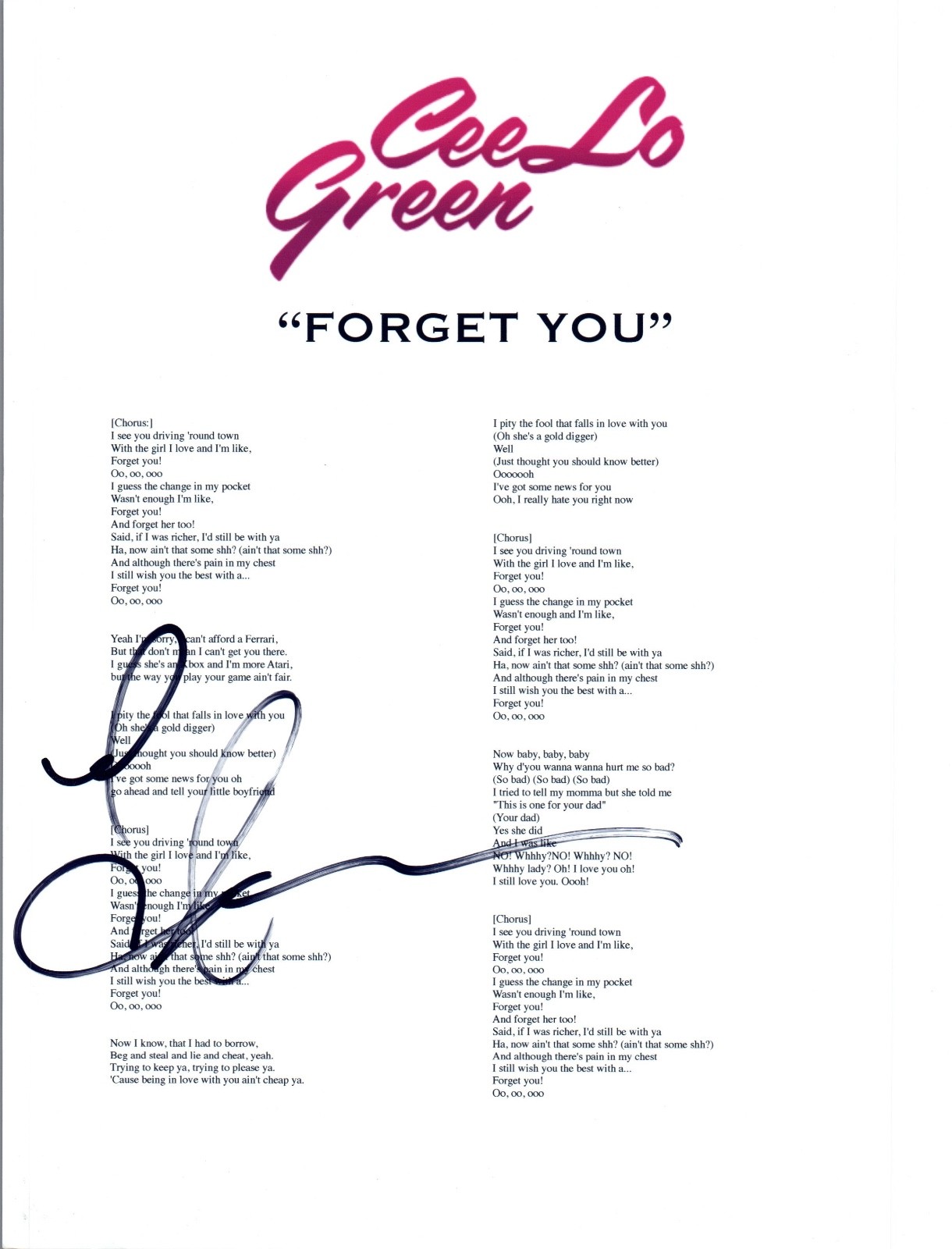 CEE LO GREEN SIGNED AUTOGRAPHED “FORGET YOU” MUSIC LYRIC SHEET COA VD COLLECTIBLE MEMORABILIA