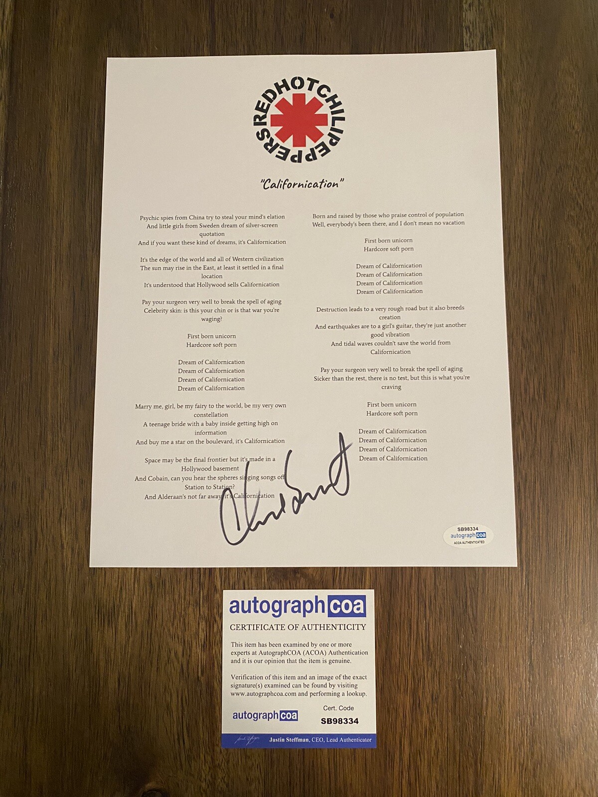 CHAD SMITH RED HOT CHILI PEPPERS ‘CALIFORNICATION’ LYRIC SHEET DRUMMER ACOA COLLECTIBLE MEMORABILIA