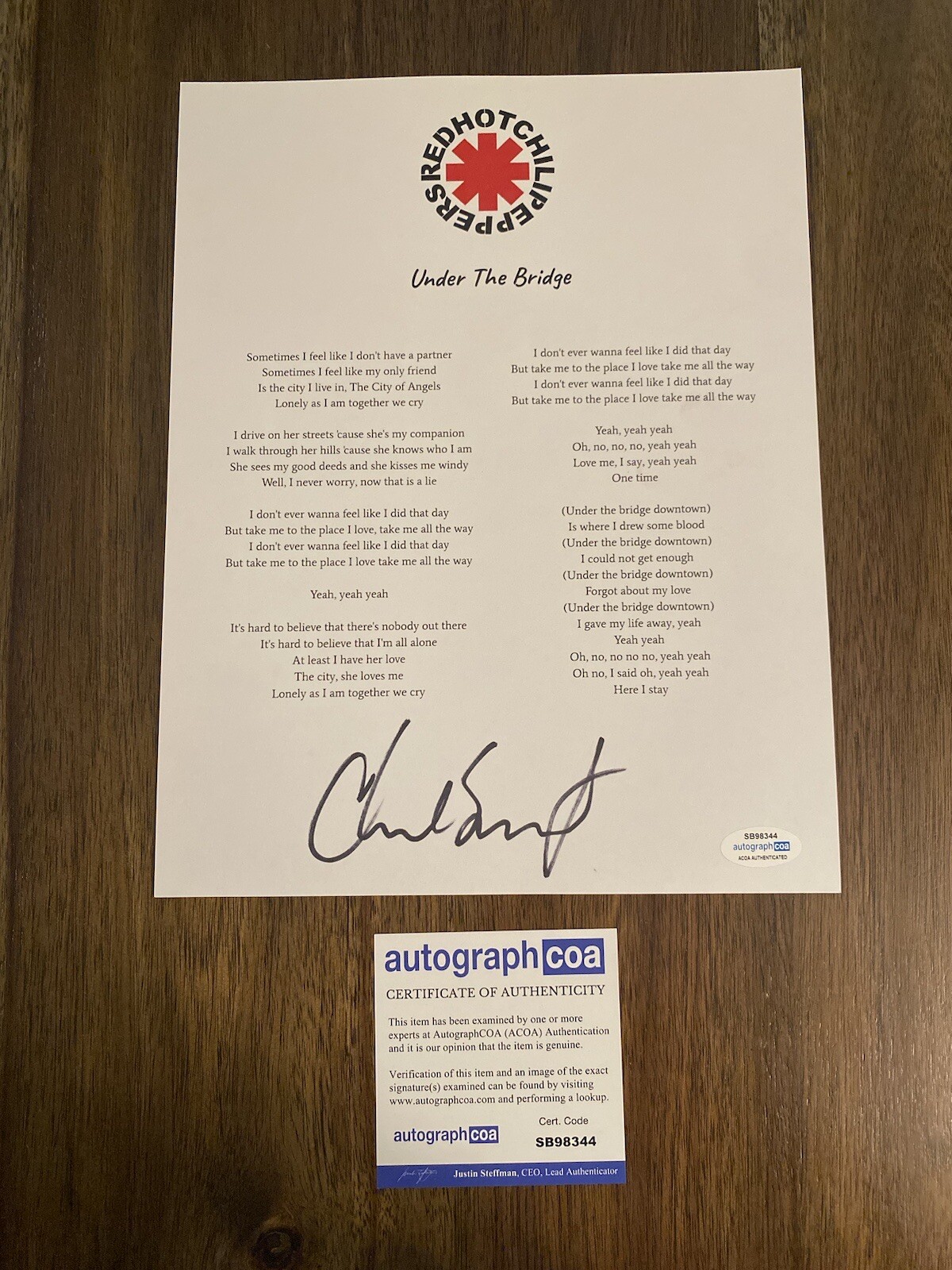 CHAD SMITH RED HOT CHILI PEPPERS ‘UNDER THE BRIDGE’ LYRIC SHEET DRUMMER ACOA COLLECTIBLE MEMORABILIA