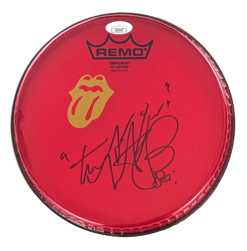 CHARLIE WATTS THE ROLLING STONES SIGNED AUTOGRAPH 8″ TONGUE DRUMHEAD W/ JSA COA COLLECTIBLE MEMORABILIA