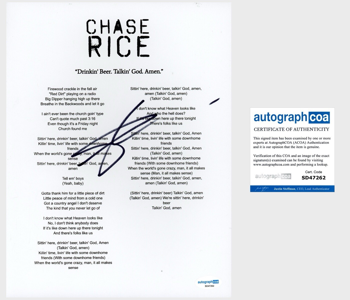 CHASE RICE ‘DRINKIN’ BEER. TALKIN’ GOD. AMEN.’ COUNTRY SIGNED LYRIC SHEET ACOA COLLECTIBLE MEMORABILIA