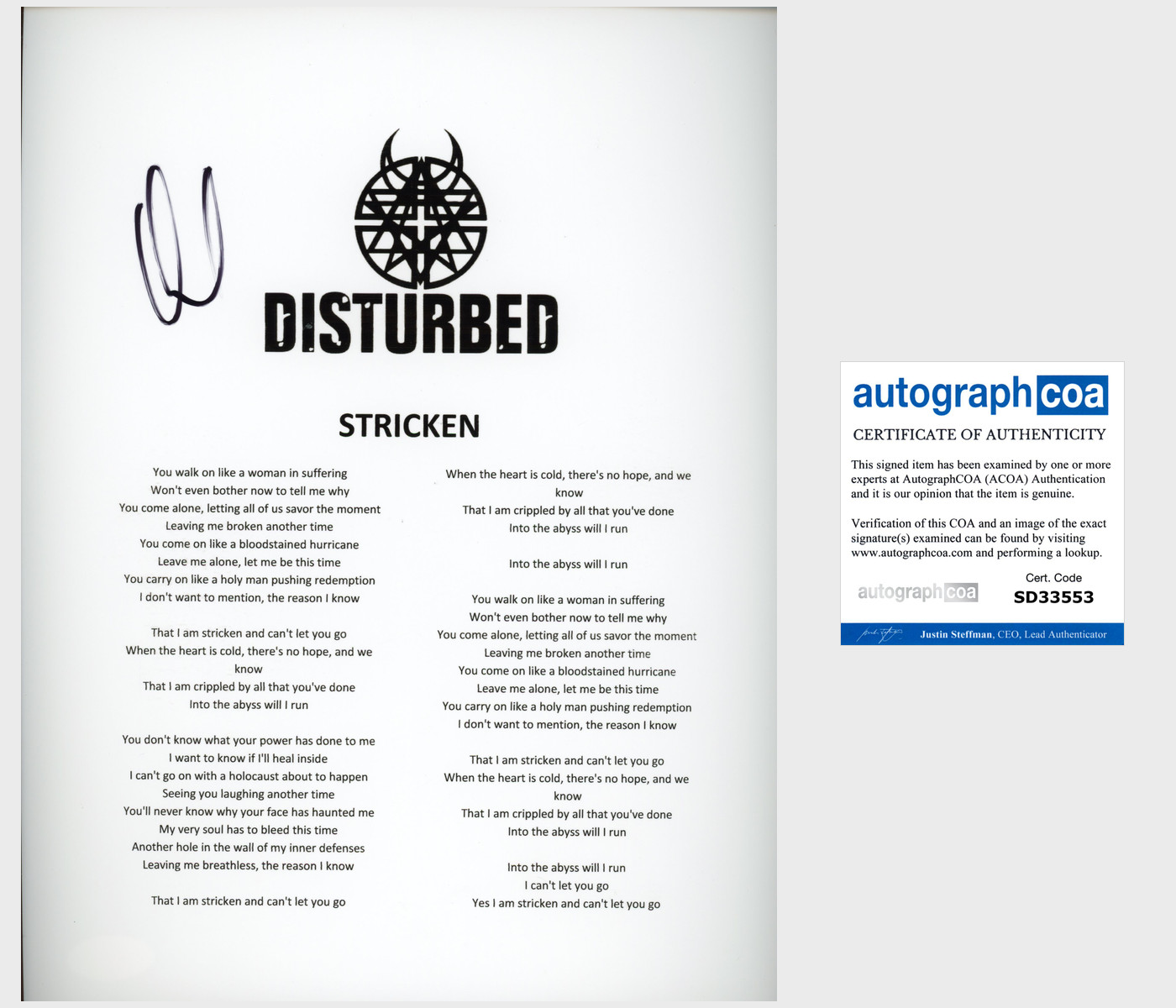DAVID DRAIMAN SIGNED AUTOGRAPH DISTURBED STRICKEN LYRIC SHEET W/EXACT PROOF COLLECTIBLE MEMORABILIA