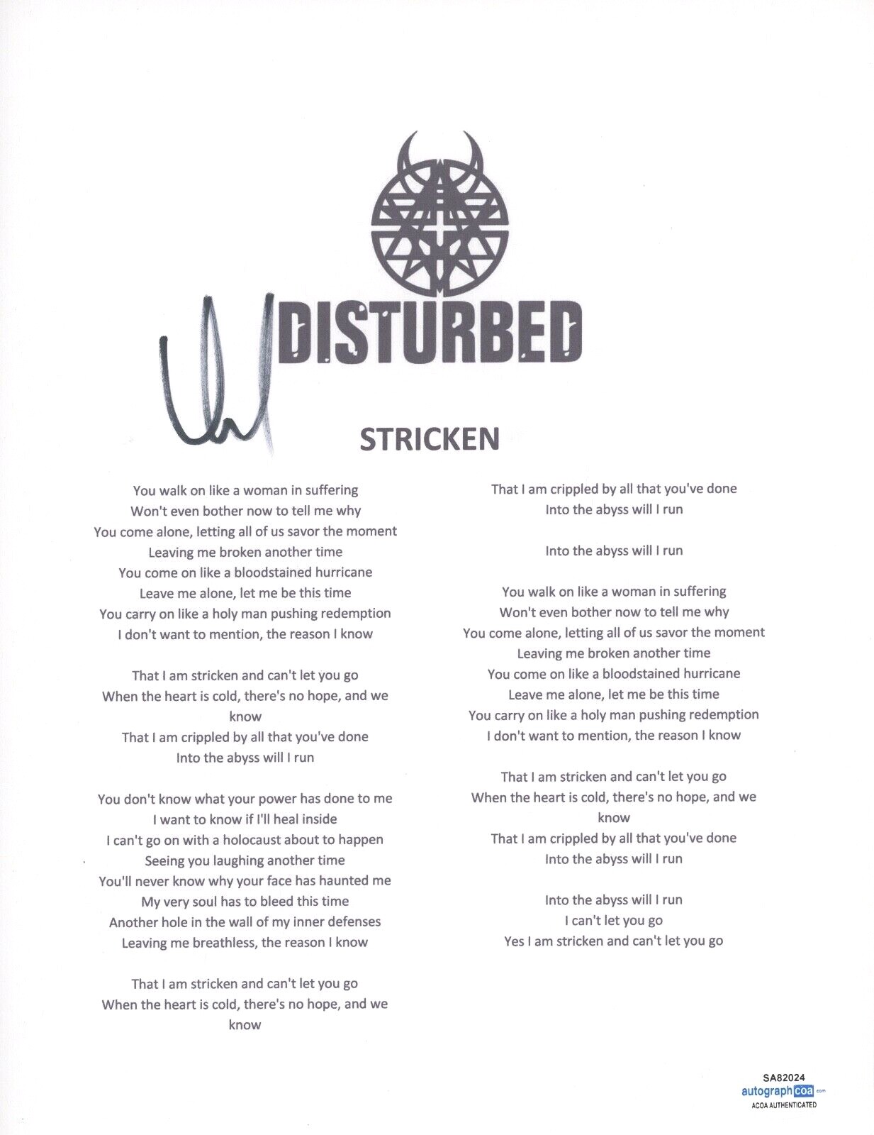 DAVID DRAIMAN SIGNED AUTOGRAPHED DISTURBED STRICKEN SONG LYRIC SHEET ACOA COA COLLECTIBLE MEMORABILIA