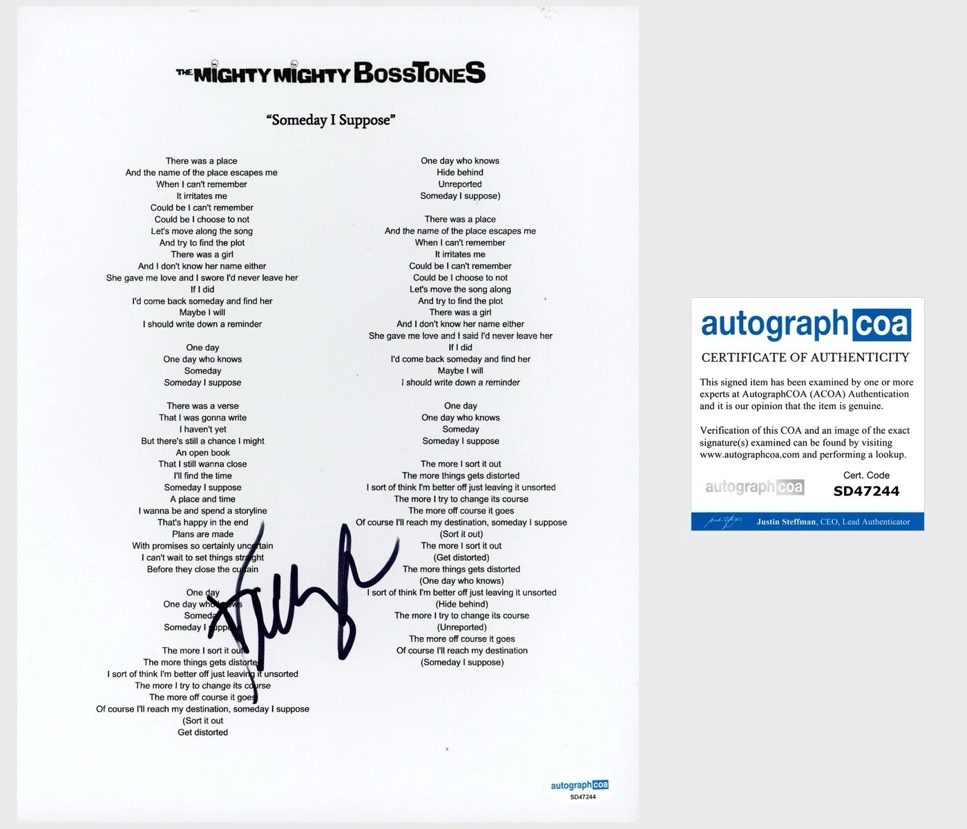 DICKY BARRETT MIGHTY MIGHTY BOSSTONES SIGNED LYRIC SHEET SOMEDAY I SUPPOSE ACOA COLLECTIBLE MEMORABILIA