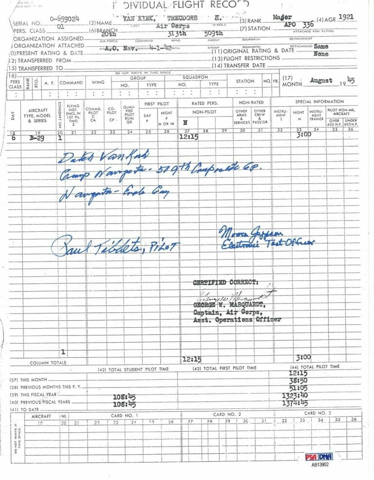 DUTCH VAN KIRK SIGNED FLIGHT RECORD DOCUMENT PSA DNA AB13902 TIBBETS JEPPSON COLLECTIBLE MEMORABILIA