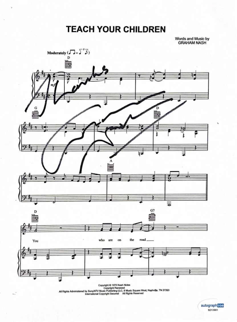 GRAHAM NASH SIGNED AUTOGRAPH LYRIC SHEET MUSIC TEACH YOUR CHILDREN ACOA COLLECTIBLE MEMORABILIA