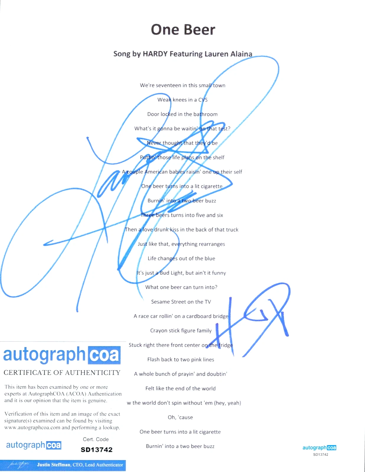 HARDY LAUREN ALAINA SIGNED AUTOGRAPH LYRIC SHEET MUSIC ONE BEER ACOA COLLECTIBLE MEMORABILIA