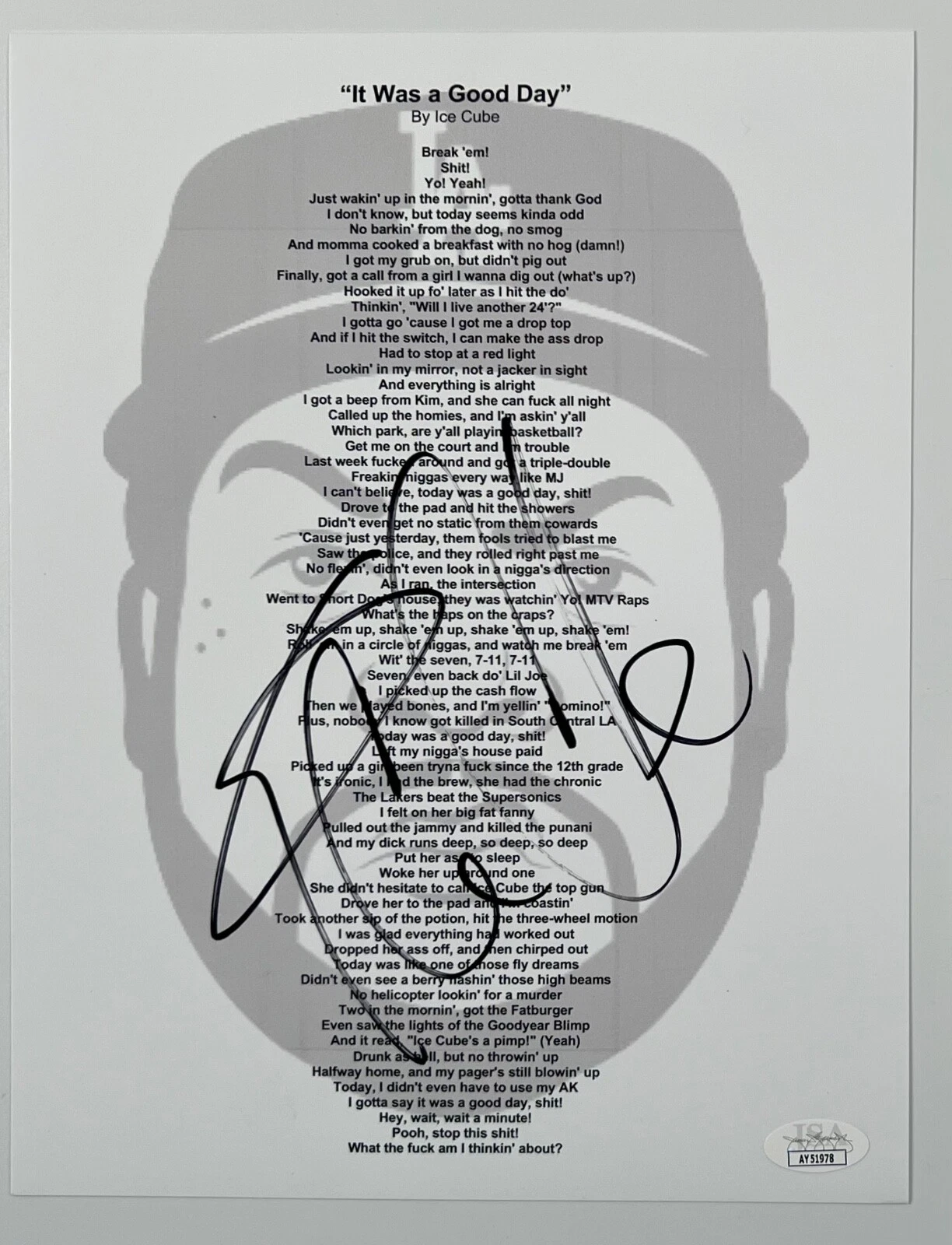 ICE CUBE SIGNED JSA AUTOGRAPH LYRIC SHEET IT WAS A GOOD DAY COLLECTIBLE MEMORABILIA