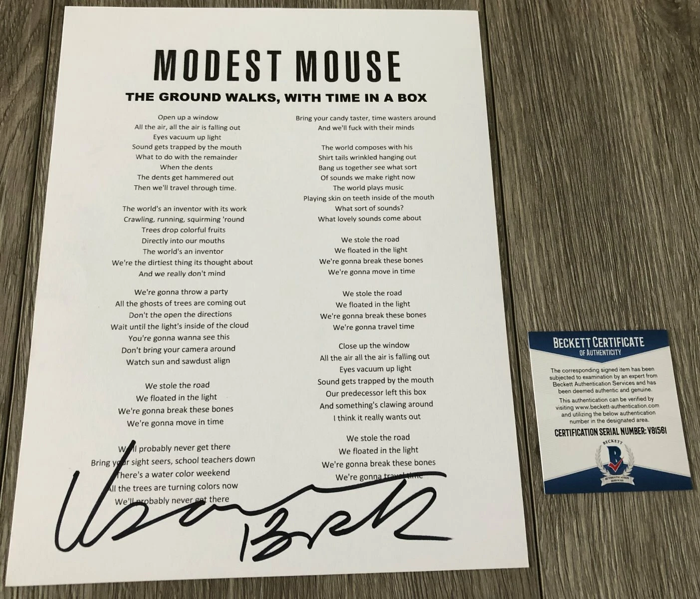 ISAAC BROCK SIGNED MODEST MOUSE THE GROUND WALKS LYRIC SHEET W/PROOF BECKETT COA COLLECTIBLE MEMORABILIA