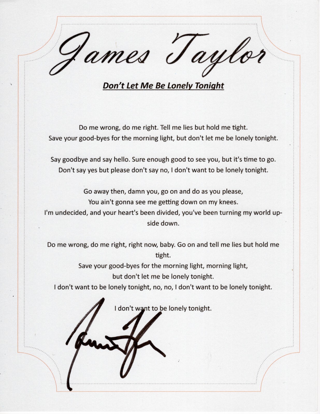 JAMES TAYLOR SIGNED DONT LET ME BE LONELY TONIGHT LYRIC SHEET COLLECTIBLE MEMORABILIA