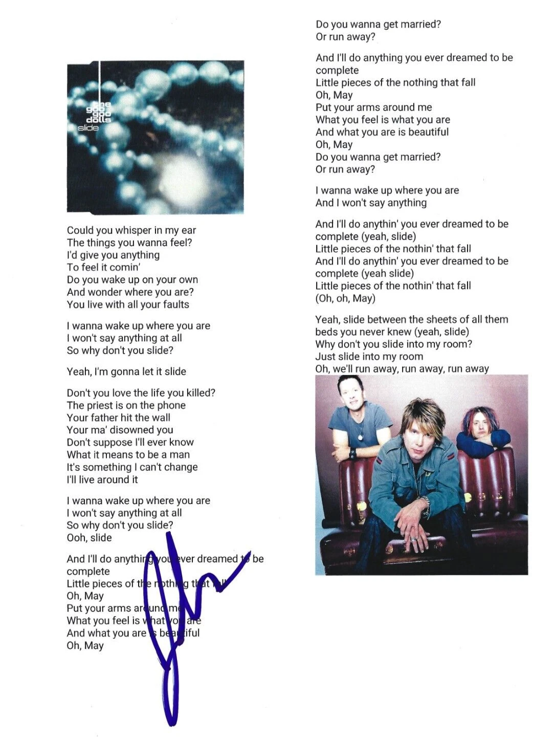 JOHNNY RZEZNIK SIGNED SLIDE LYRIC SHEET GOO GOO DOLLS AUTHENTIC AUTOGRAPH COLLECTIBLE MEMORABILIA