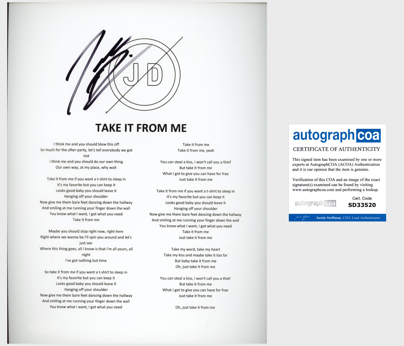 JORDAN DAVIS SIGNED AUTOGRAPH TAKE IT FROM ME LYRIC SHEET W/EXACT PROOF COLLECTIBLE MEMORABILIA