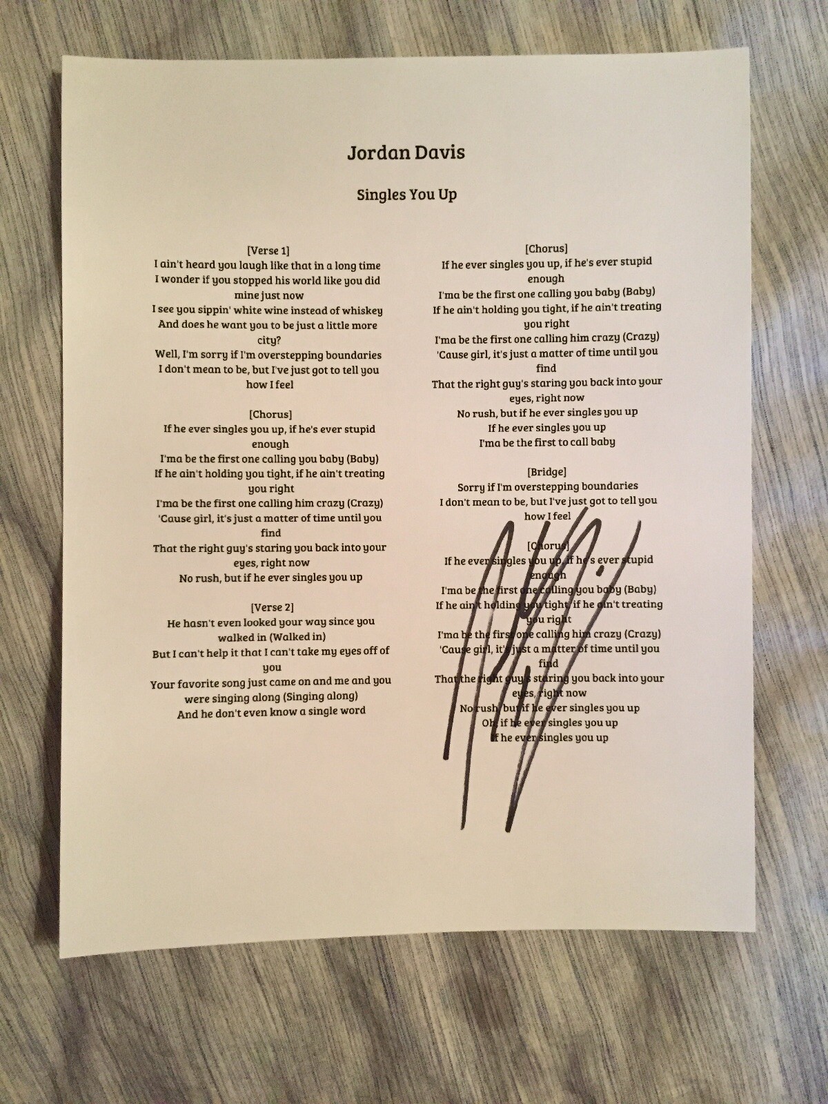 JORDAN DAVIS SIGNED AUTOGRAPHED SINGLES YOU UP LYRIC SHEET AUTHENTIC PROOF 2 COLLECTIBLE MEMORABILIA