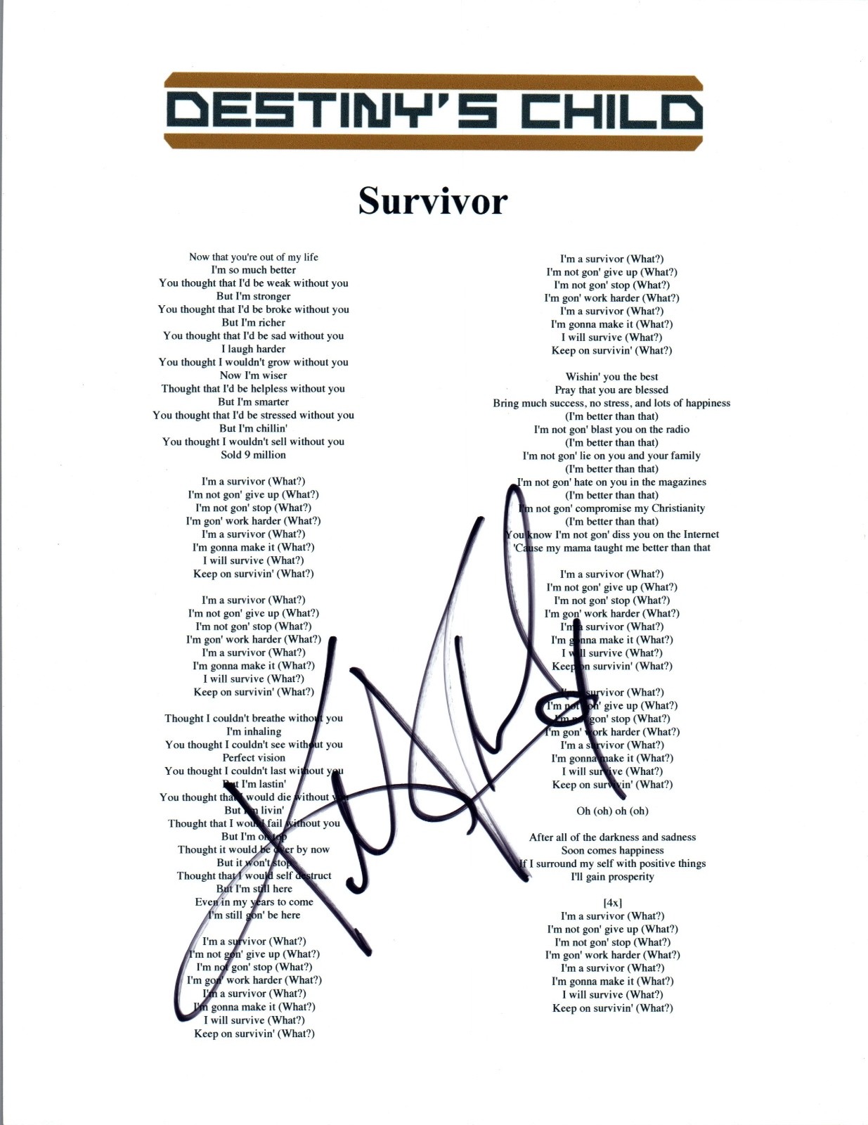 KELLY ROWLAND SIGNED AUTOGRAPHED DESTINY’S CHILD SURVIVOR LYRIC SHEET COA COLLECTIBLE MEMORABILIA
