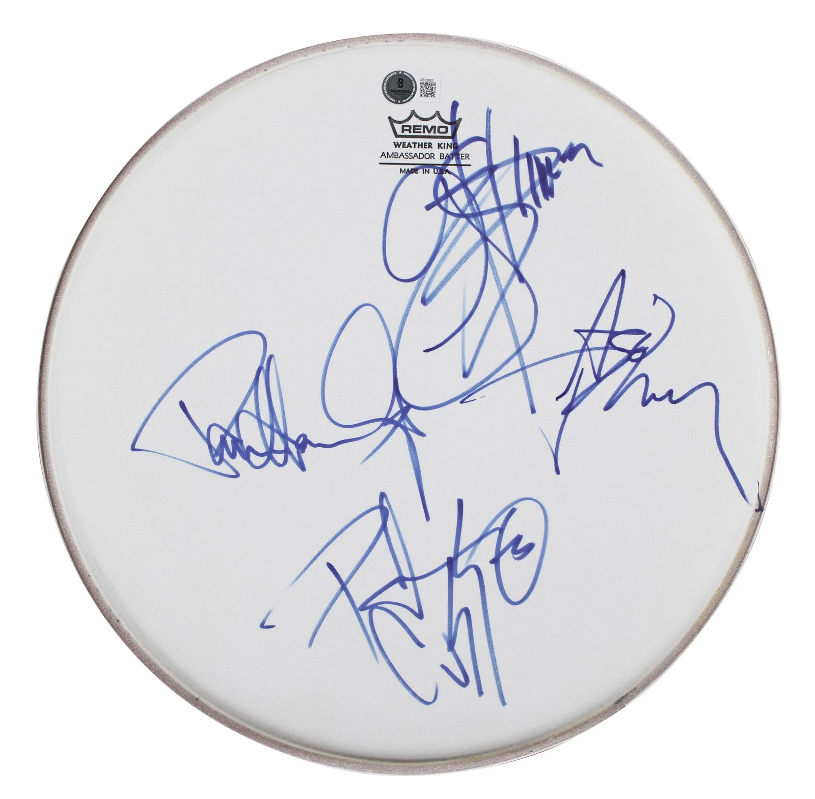 KISS (4) SIMMONS, FREHLEY, STANLEY & CRISS SIGNED 13 INCH DRUM HEAD BAS #AE02883 COLLECTIBLE MEMORABILIA