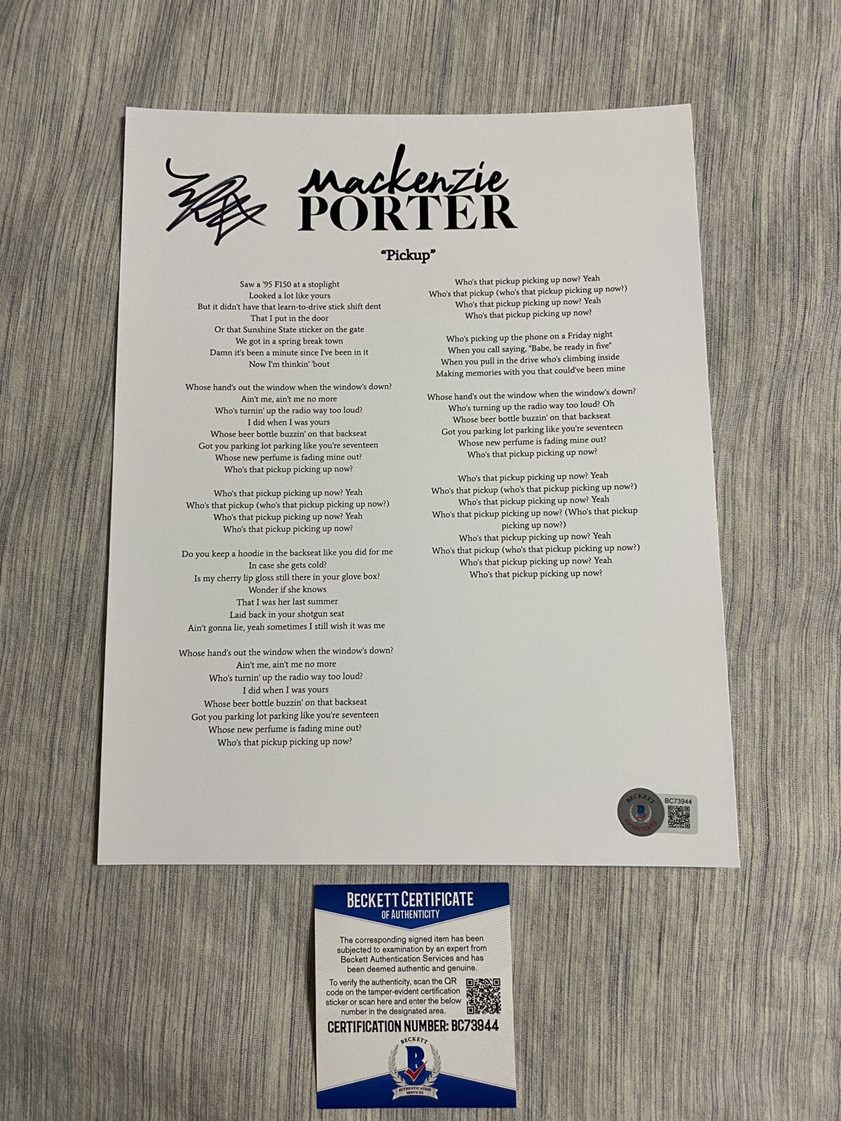 MACKENZIE PORTER SIGNED AUTOGRAPHED PICKUP LYRIC SHEET BECKETT COA COLLECTIBLE MEMORABILIA