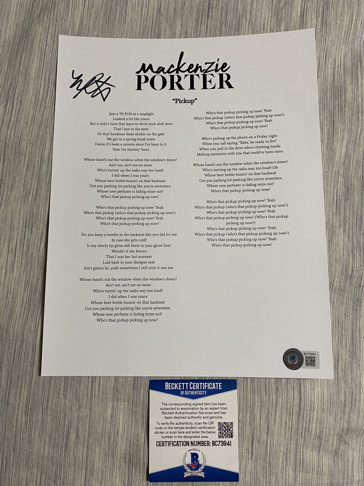 MACKENZIE PORTER SIGNED AUTOGRAPHED PICKUP LYRIC SHEET BECKETT COA COLLECTIBLE MEMORABILIA