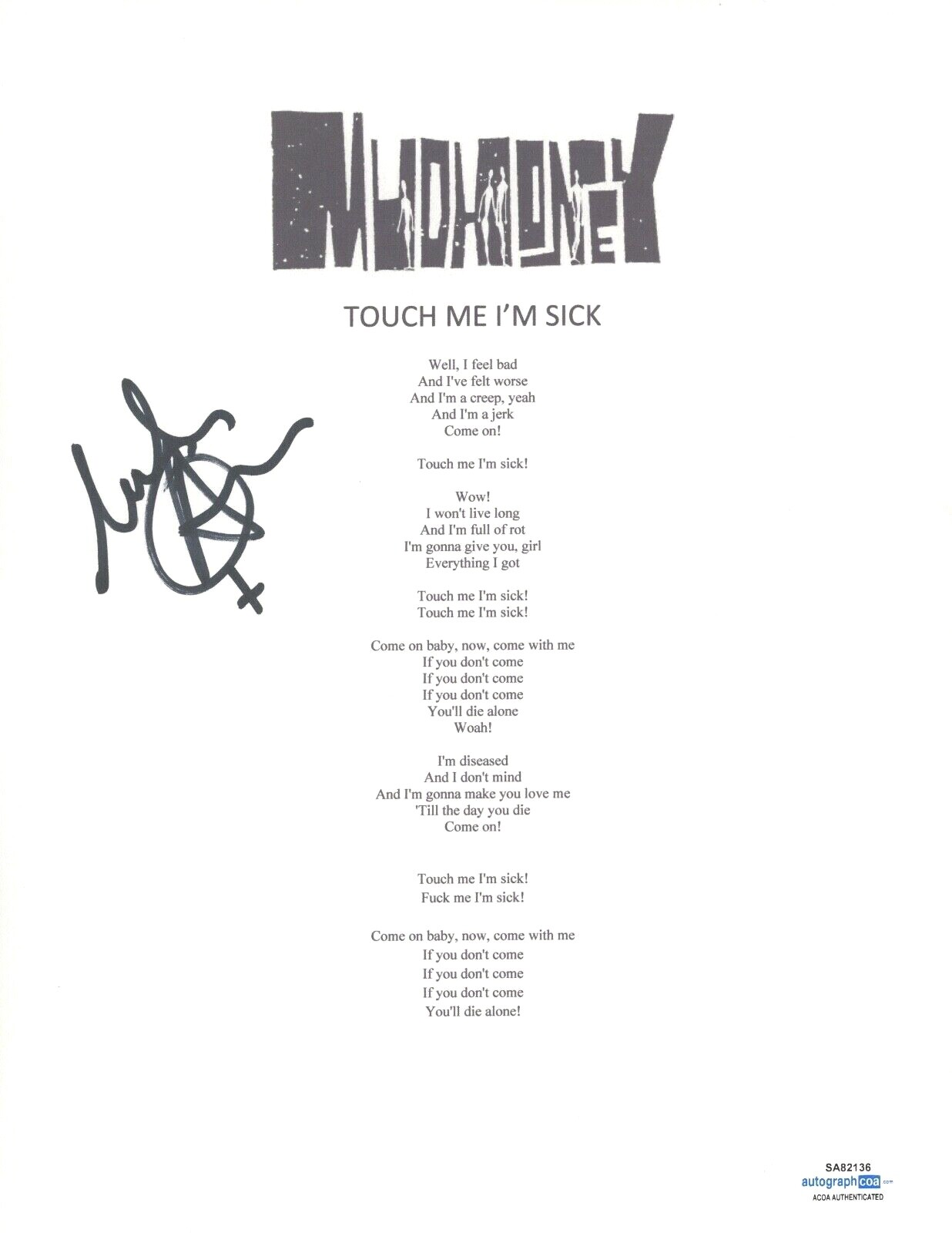 MARK ARM SIGNED AUTOGRAPHED MUDHONEY TOUCH ME I’M SICK SONG LYRIC SHEET ACOA COA COLLECTIBLE MEMORABILIA