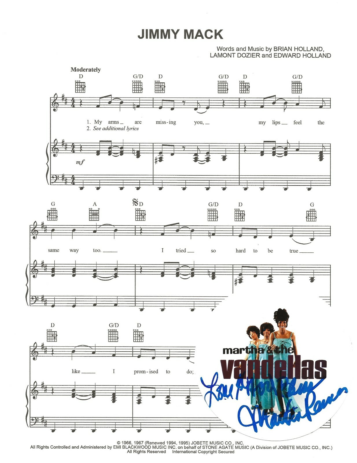 MARTHA REEVES AND THE VANDELLAS SIGNED JIMMY MACK SHEET MUSIC COA BY MARTHA COLLECTIBLE MEMORABILIA