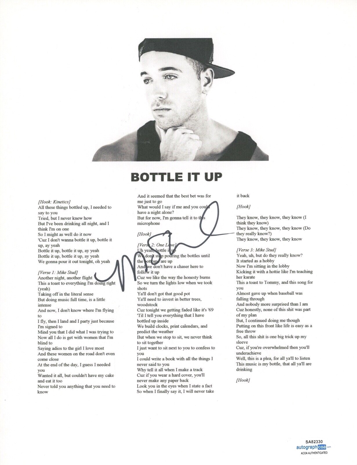 MIKE STUD SIGNED AUTOGRAPHED BOTTLE IT UP SONG LYRIC SHEET RAPPER ACOA COA COLLECTIBLE MEMORABILIA