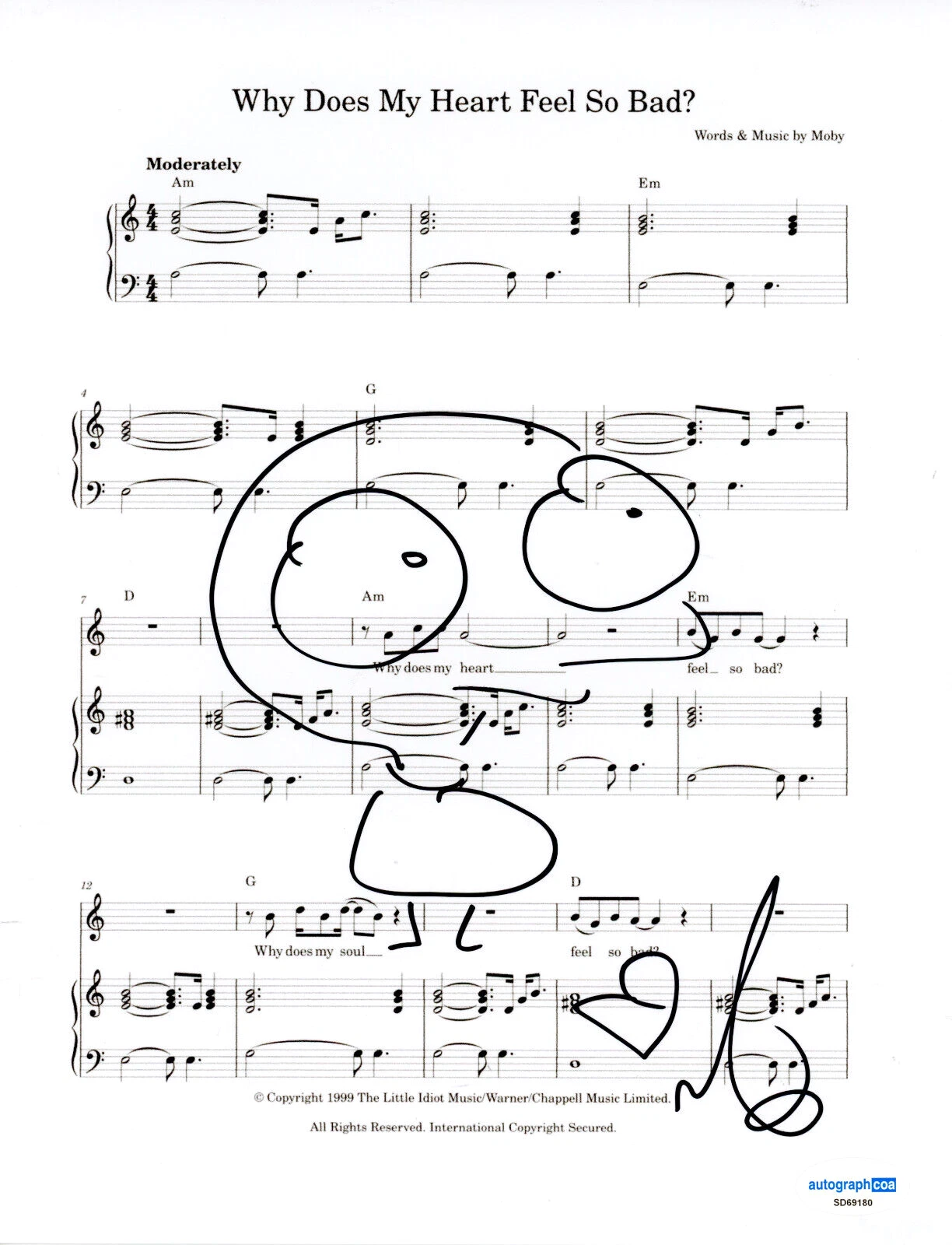 MOBY SIGNED AUTOGRAPH WHY DOES MY HEART FEEL SO BAD? SHEET MUSIC SKETCH ACOA COA COLLECTIBLE MEMORABILIA