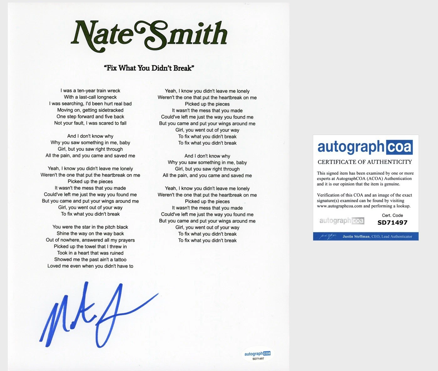 ‘NATE SMITH’ COUNTRY SINGER SIGNED ‘FIX WHAT YOU DIDN’T BREAK’ LYRIC SHEET ACOA COLLECTIBLE MEMORABILIA