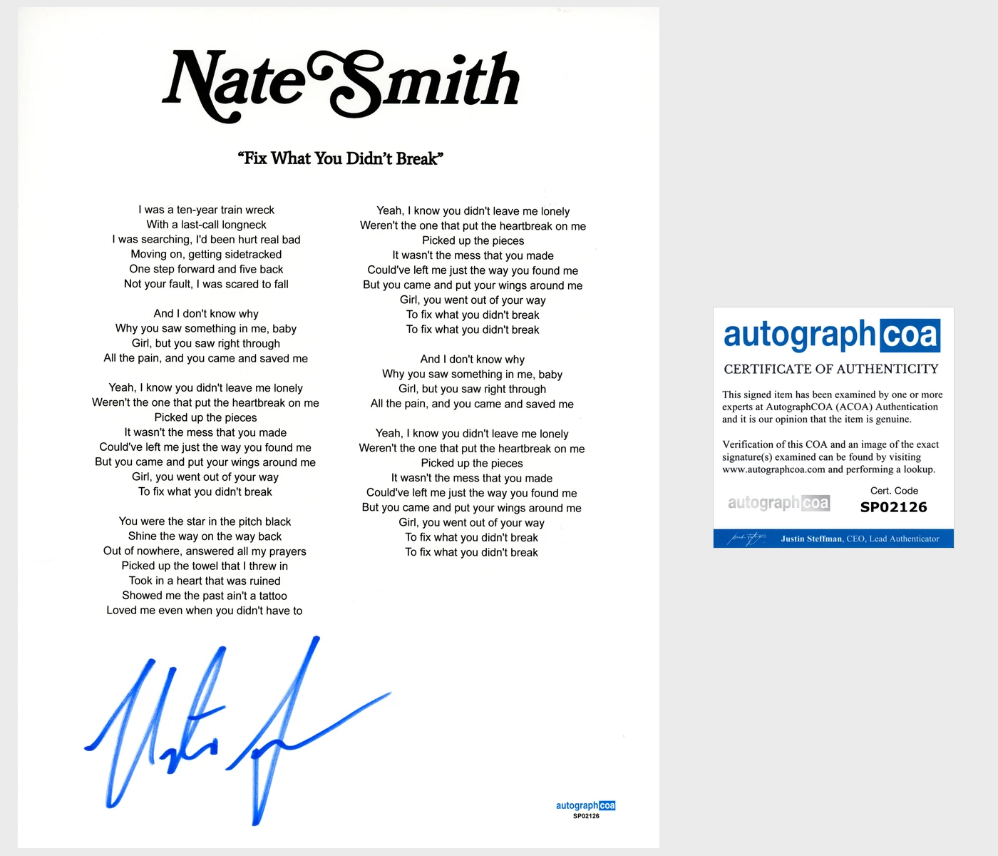‘NATE SMITH’ COUNTRY SINGER SIGNED ‘FIX WHAT YOU DIDN’T BREAK’ LYRIC SHEET ACOA COLLECTIBLE MEMORABILIA