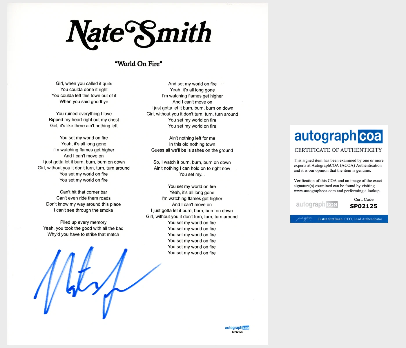 ‘NATE SMITH’ COUNTRY SINGER SIGNED ‘WORLD ON FIRE’ LYRIC SHEET AUTOGRAPH ACOA COLLECTIBLE MEMORABILIA